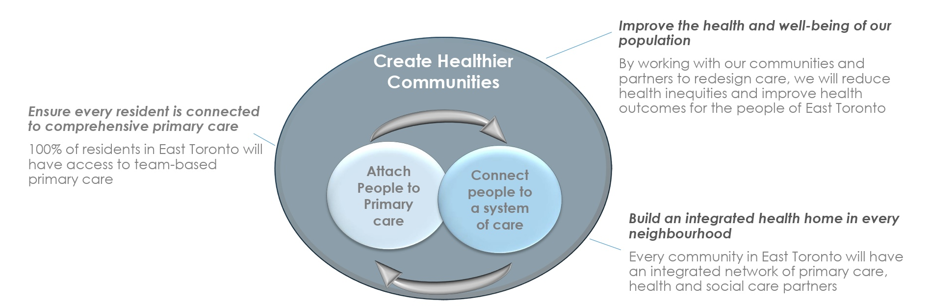 - Provide every person in East Toronto with access to team-based primary care within integrated primary health neighbourhoods